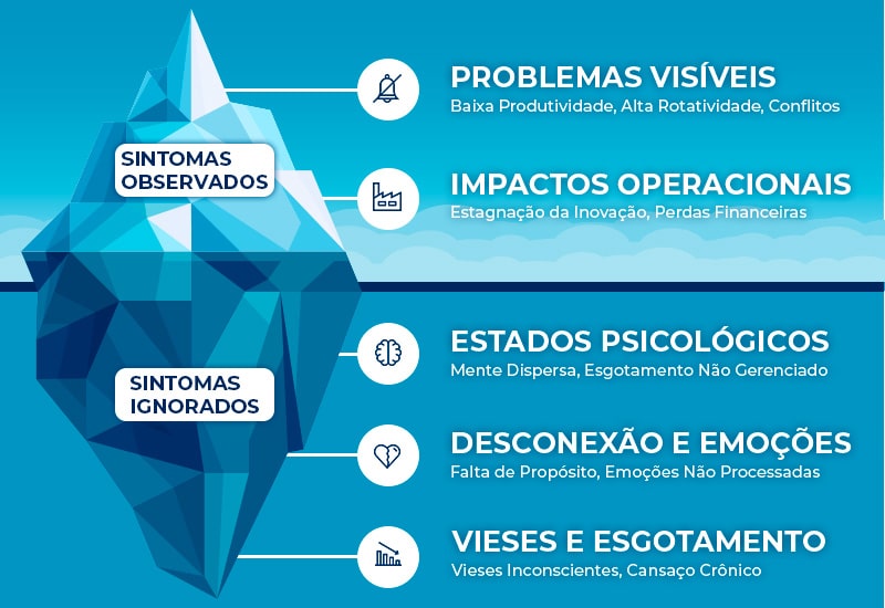 Performance baseada na exaustão não é sustentável. Colaboradores presentes (presenteísmo) mas com 30-40% da energia mental consumida pela ansiedade e autodefesa, resultando em menor criatividade e maior retrabalho.